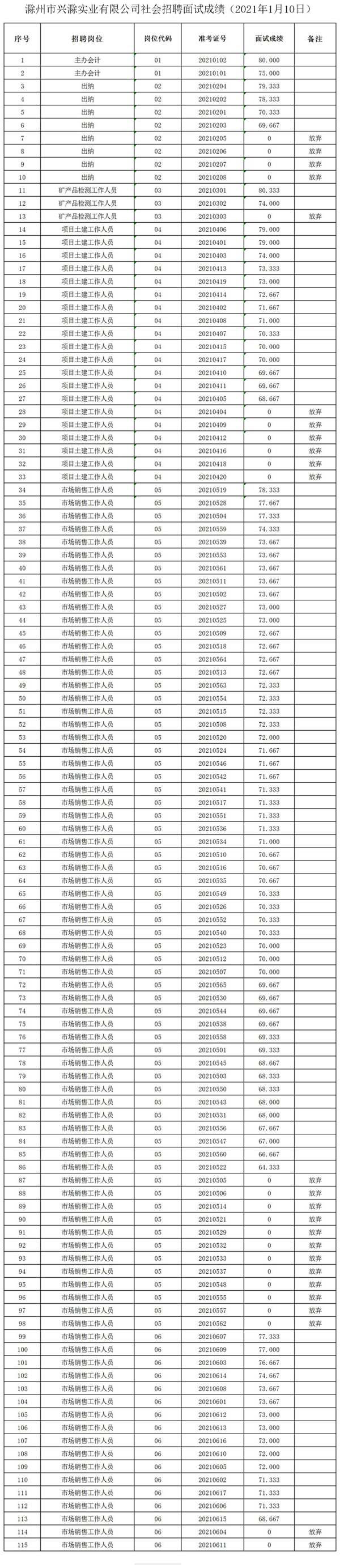 滁州市興滁實業(yè)有限公司社會招聘面試成績